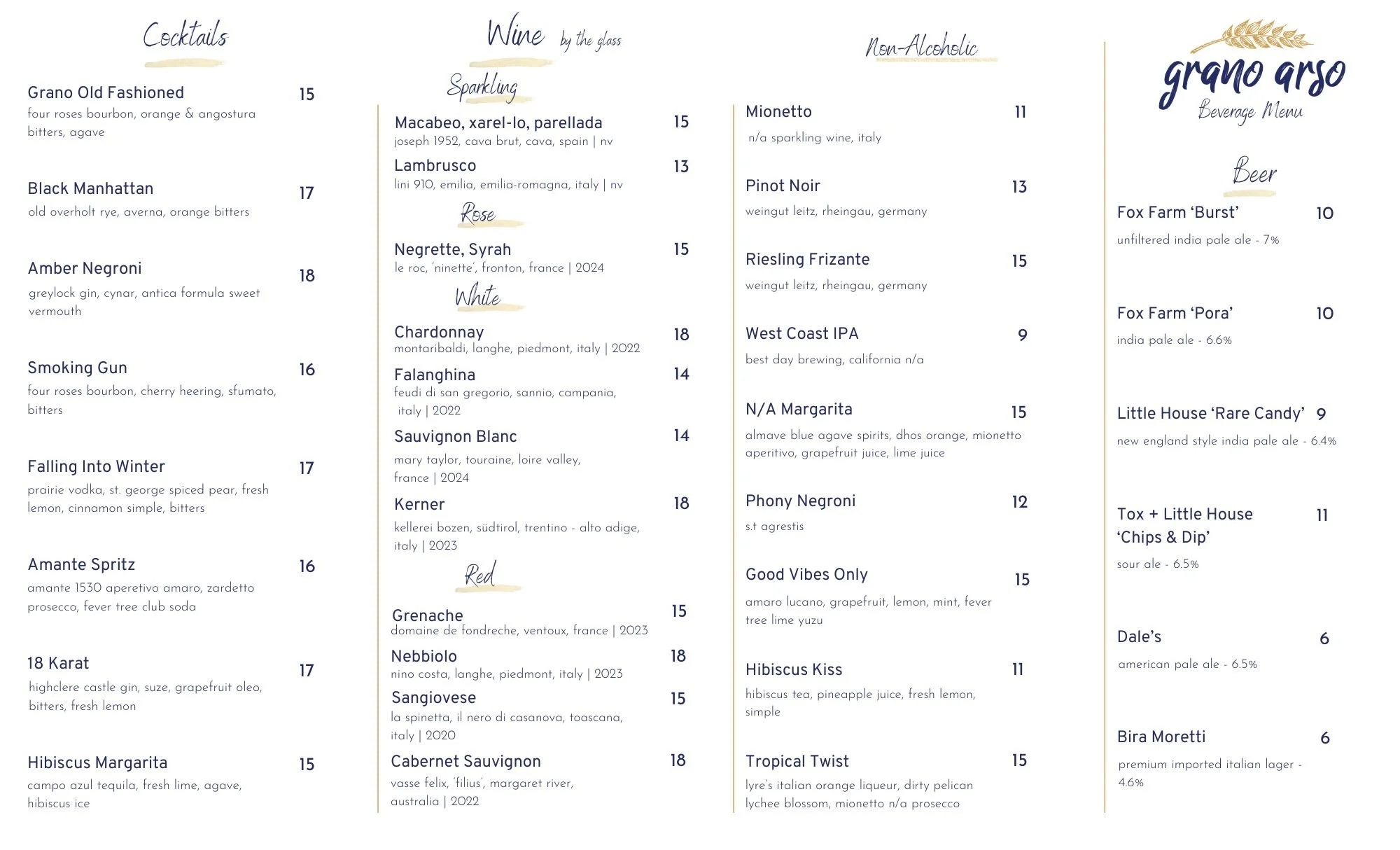 Grano Arso has a bar serving craft cocktails, expertly curated wines from around the world and local beers, brewed with integrity. Our specialty cocktail’s change with the seasons- showing inspiration, while our signature and classic cocktails are delightfully balanced and made with precision.